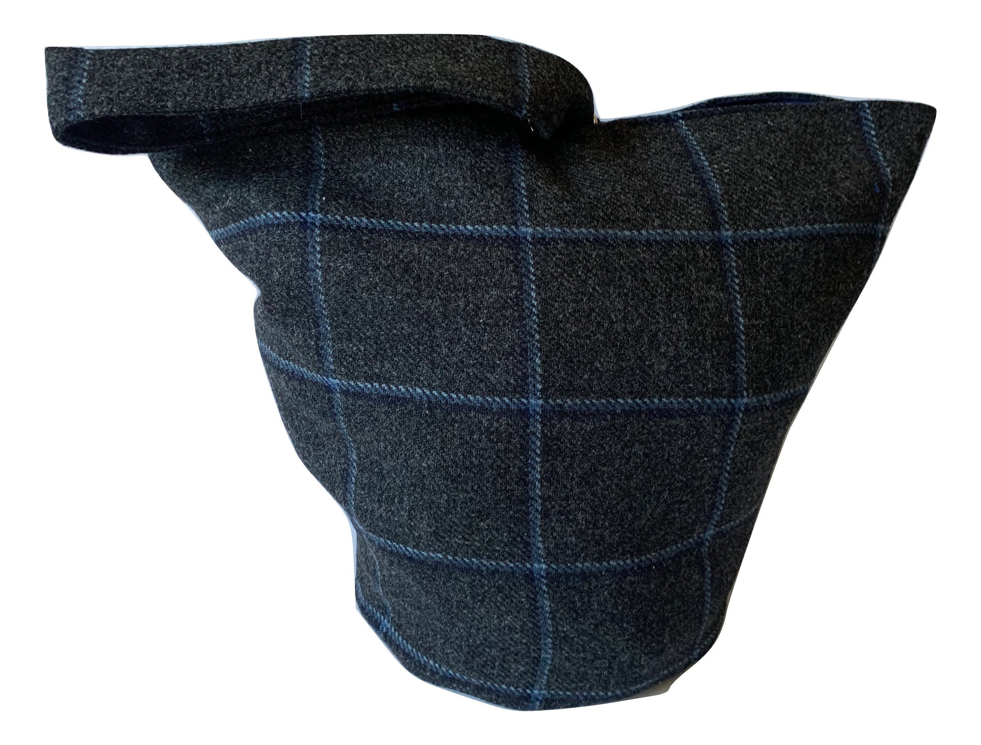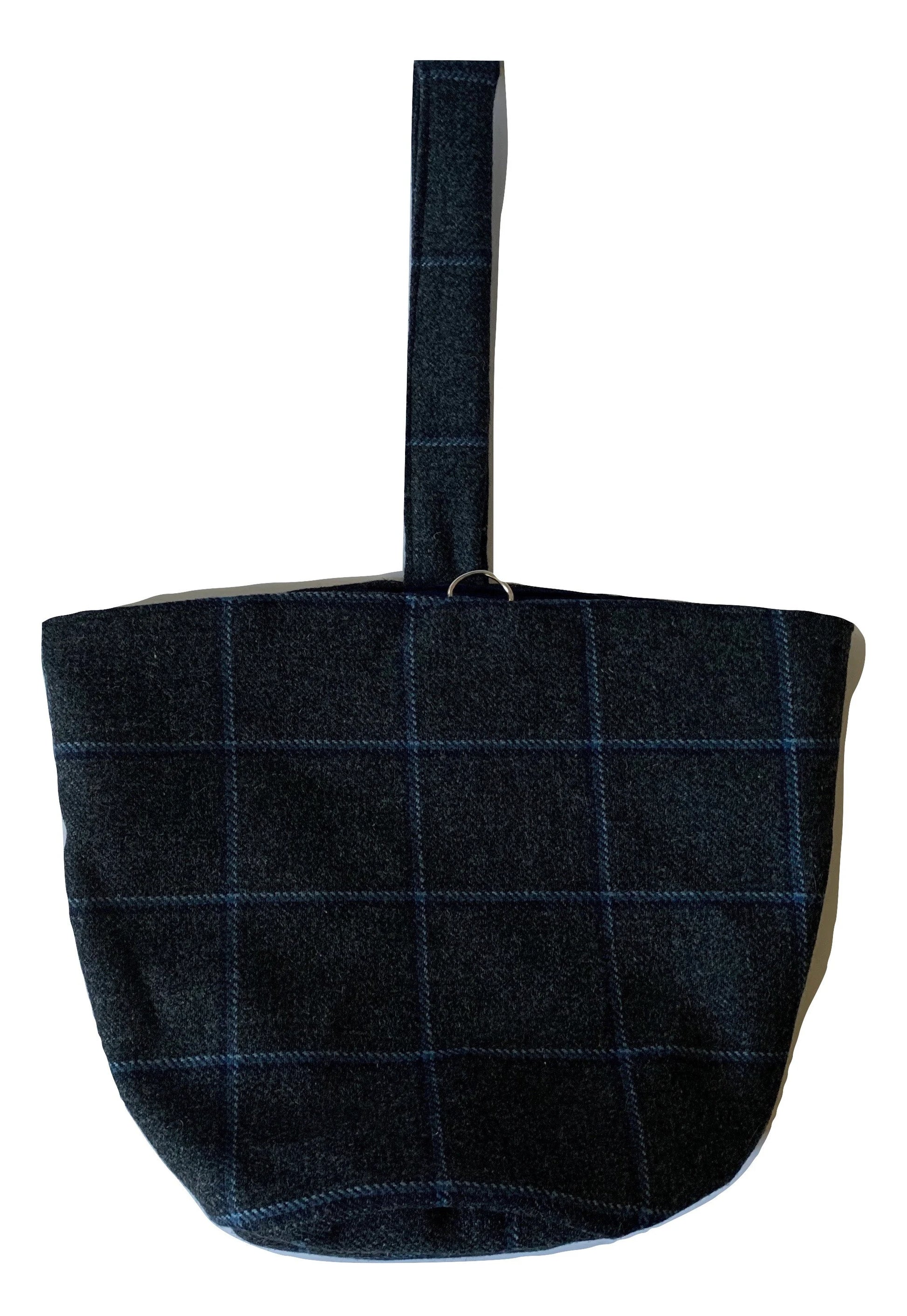 This wristlet purse is recreated from a 1940s pattern and handmade with wool tweed in a grey windowpane lined in blue cotton with two smaller pockets on the inside. Other fabrics available please contact me for other options. The main closure is the handle passing through a D ring. All of my bags are made by me and the fabric is sourced from a number of small vendors producing some of the best cloth in the world. One available and ready to ship.