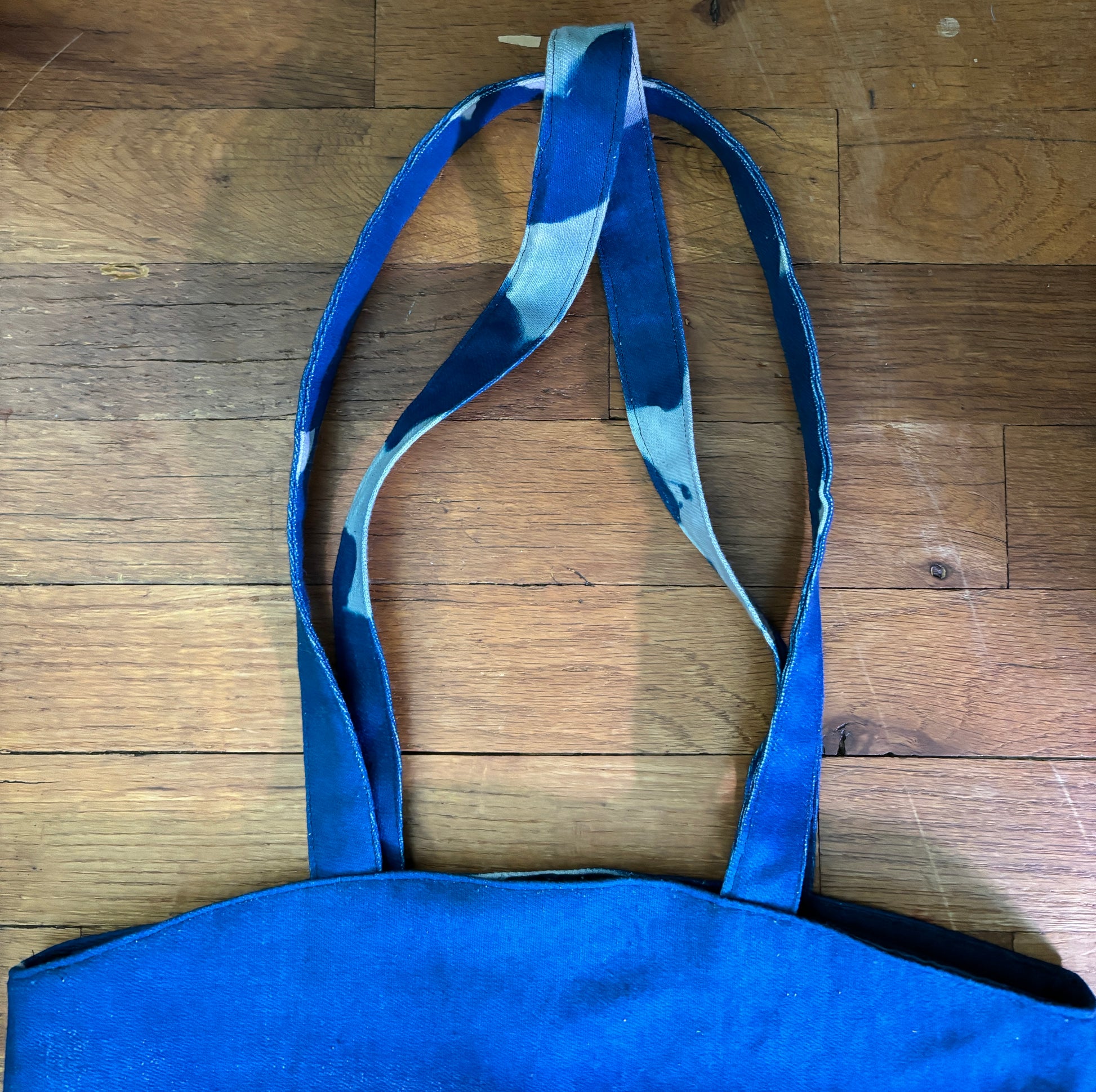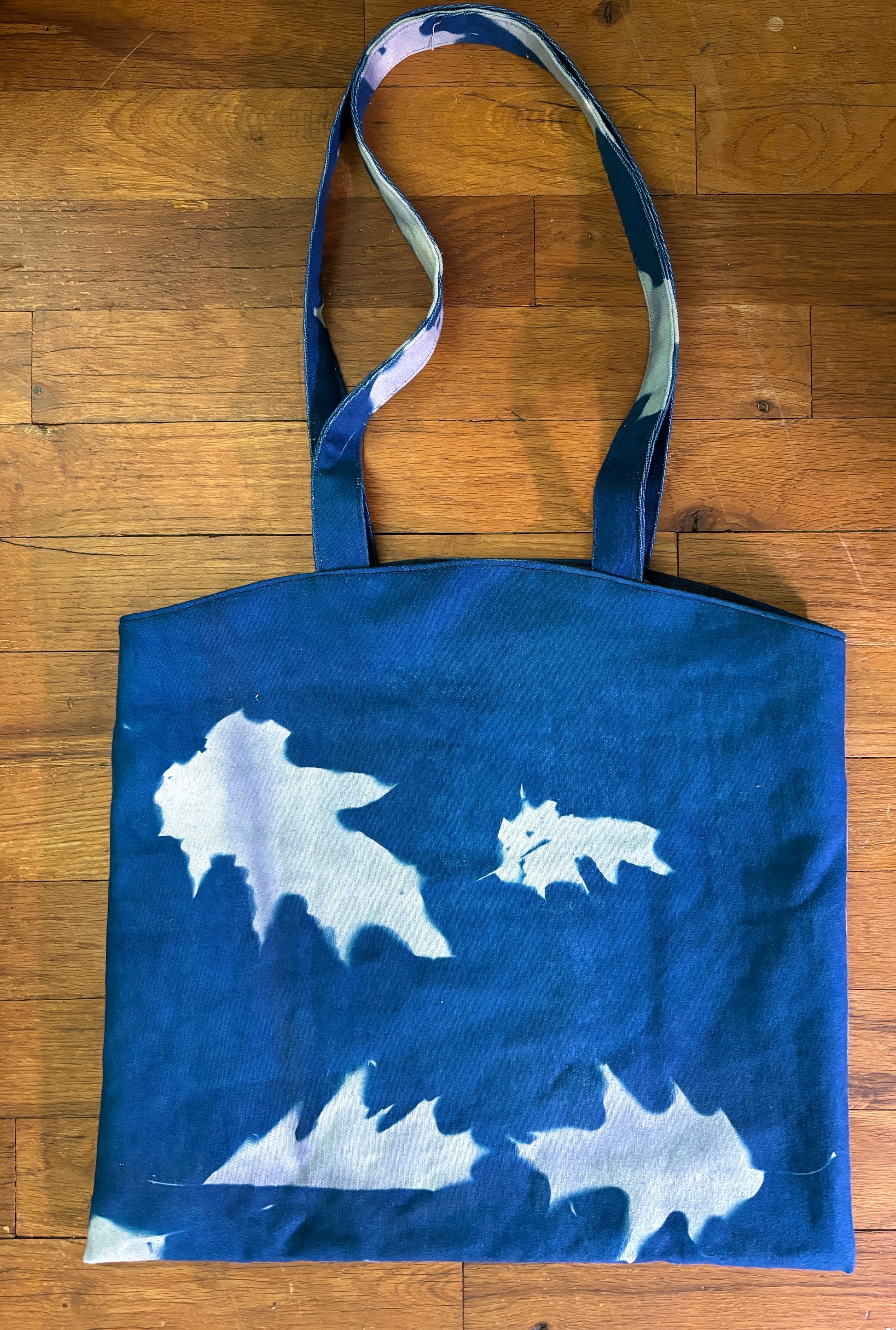 Double Sided Leaf Cyanotype Tote made out of durable cotton fabric and gone through the cyanotype process using leaves creating the well known blue color and lined in cotton. Both sides of the bag have the cyanotype leaf design each different. The Tote measures a height of 13.5 inches, width of 15 inches and the strap length is 12 inches. Each one will be unique as I place the leaves in different places each time. This example is finished and ready to ship!